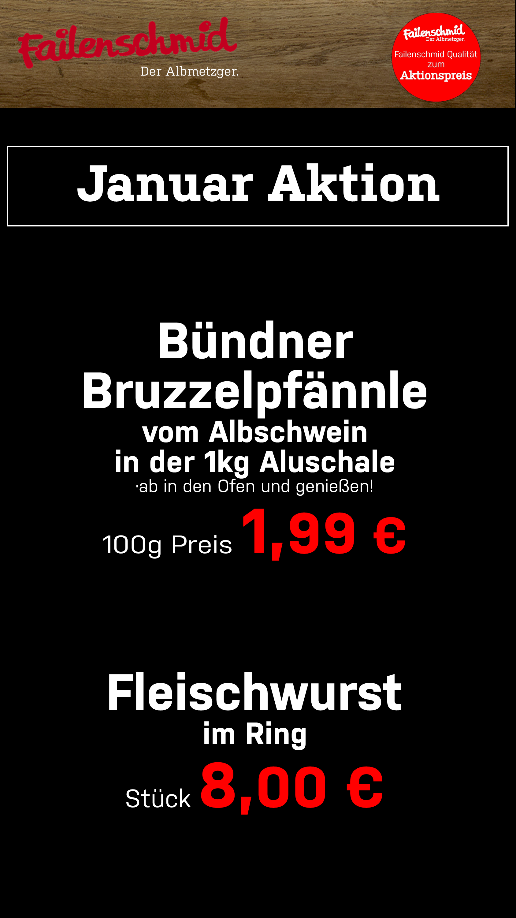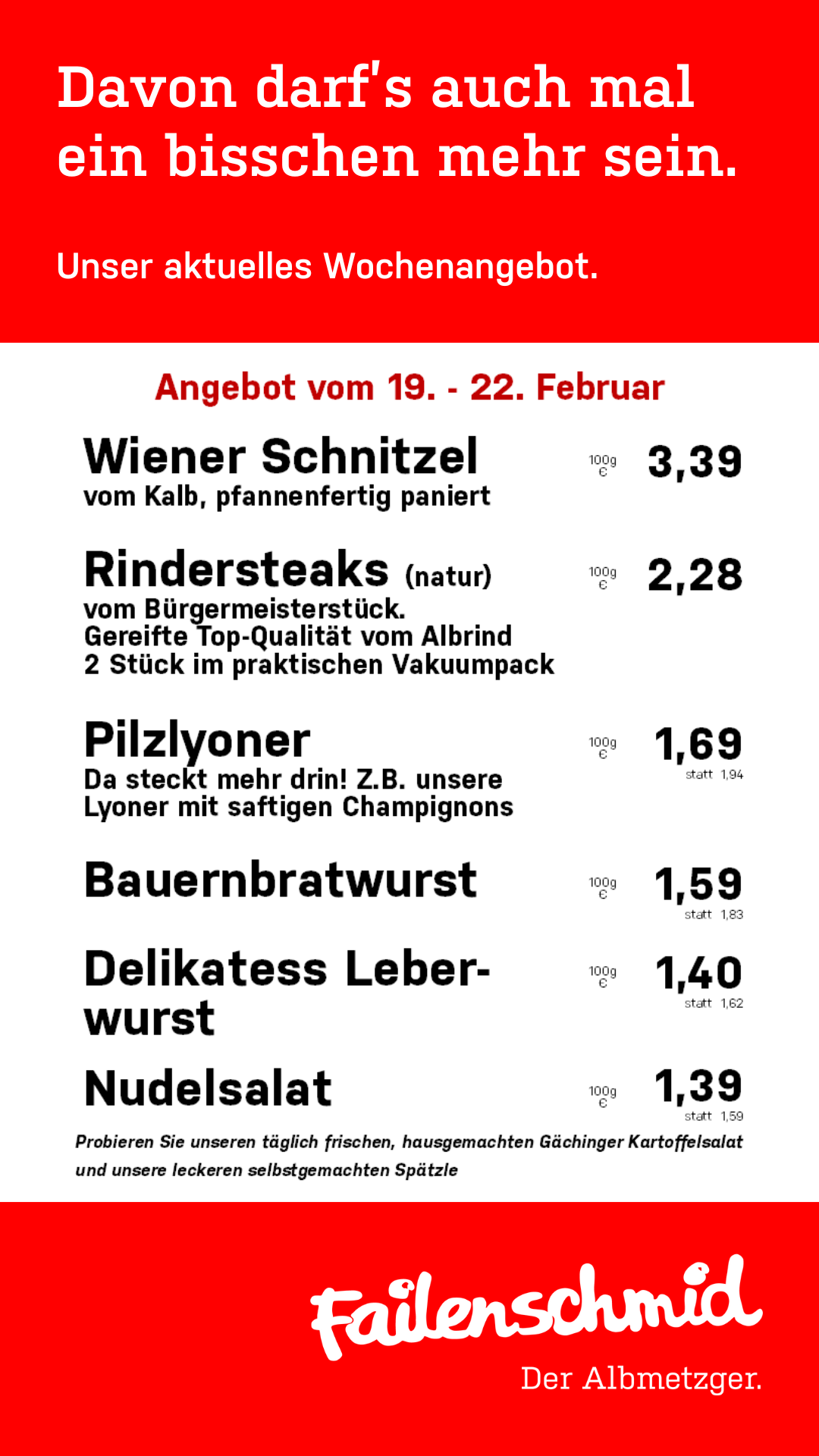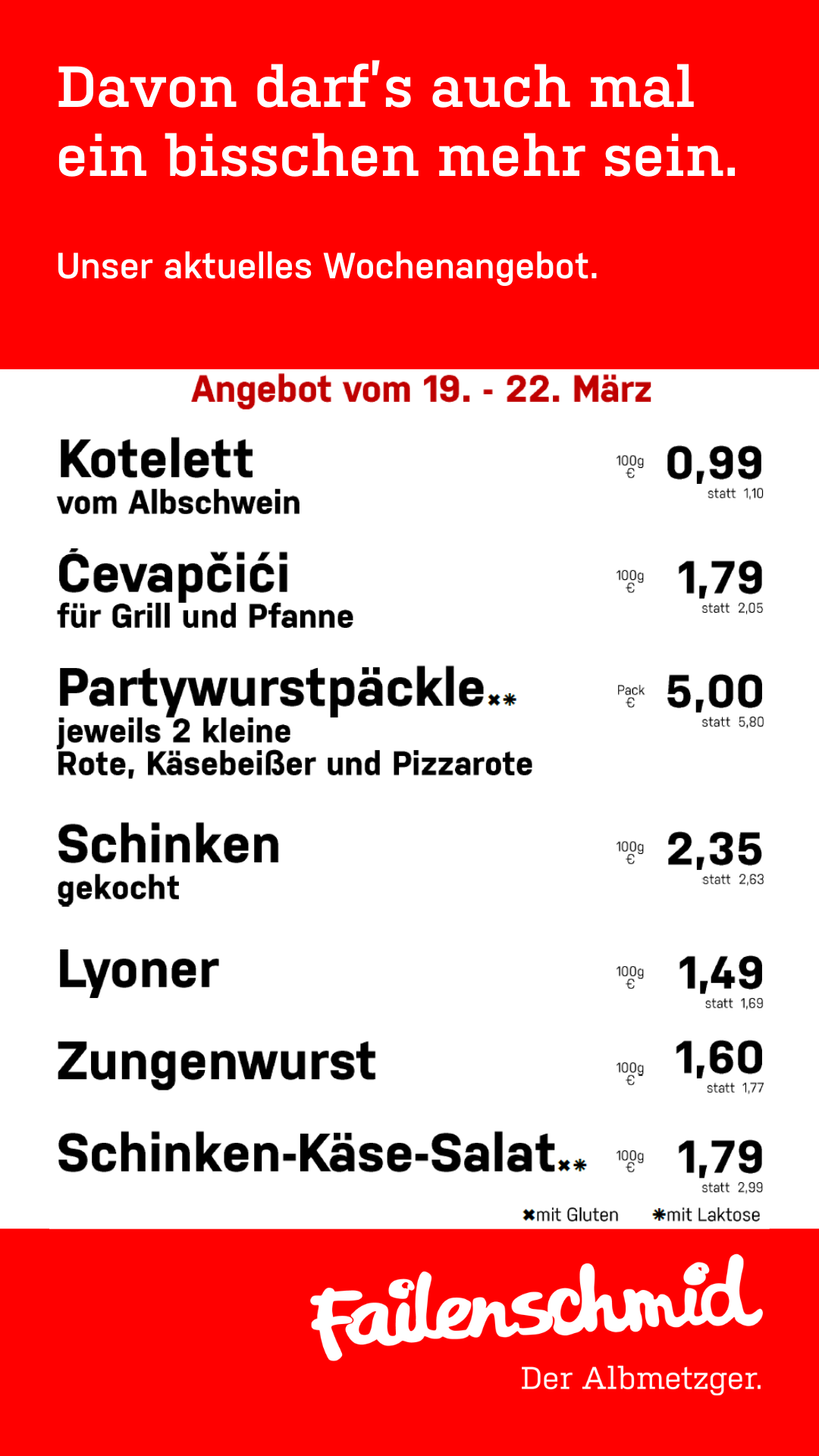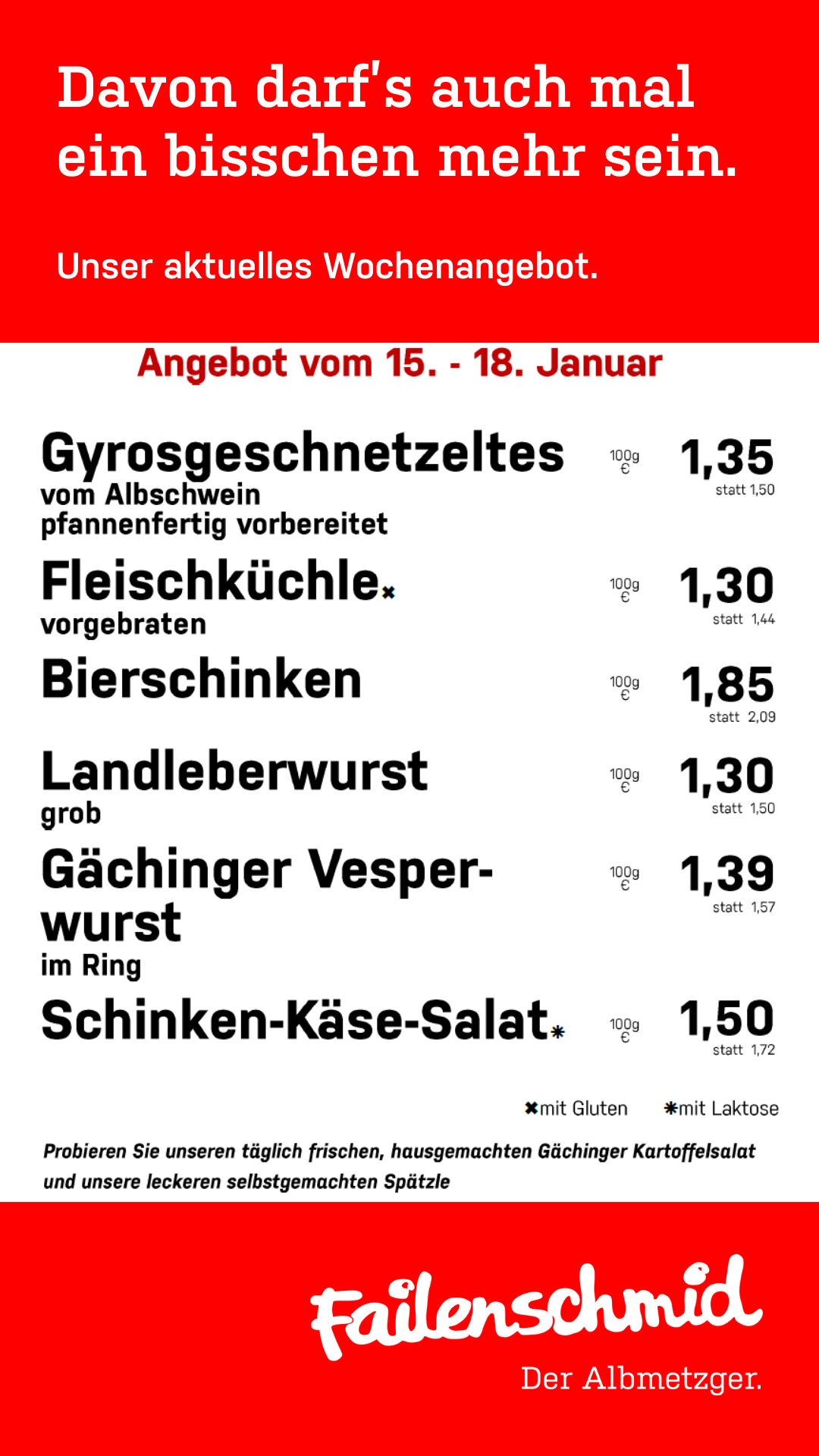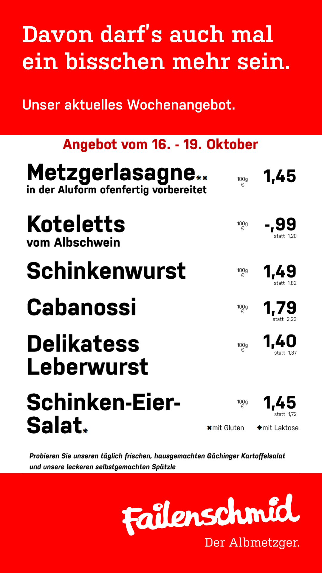 Davon darf's auch mal ein bisschen mehr sein. Unser aktuelles Wochenangebot aus der Albmetzgerei für unsere Filialen im Landkreis Reutlingen (nicht Merklingen).