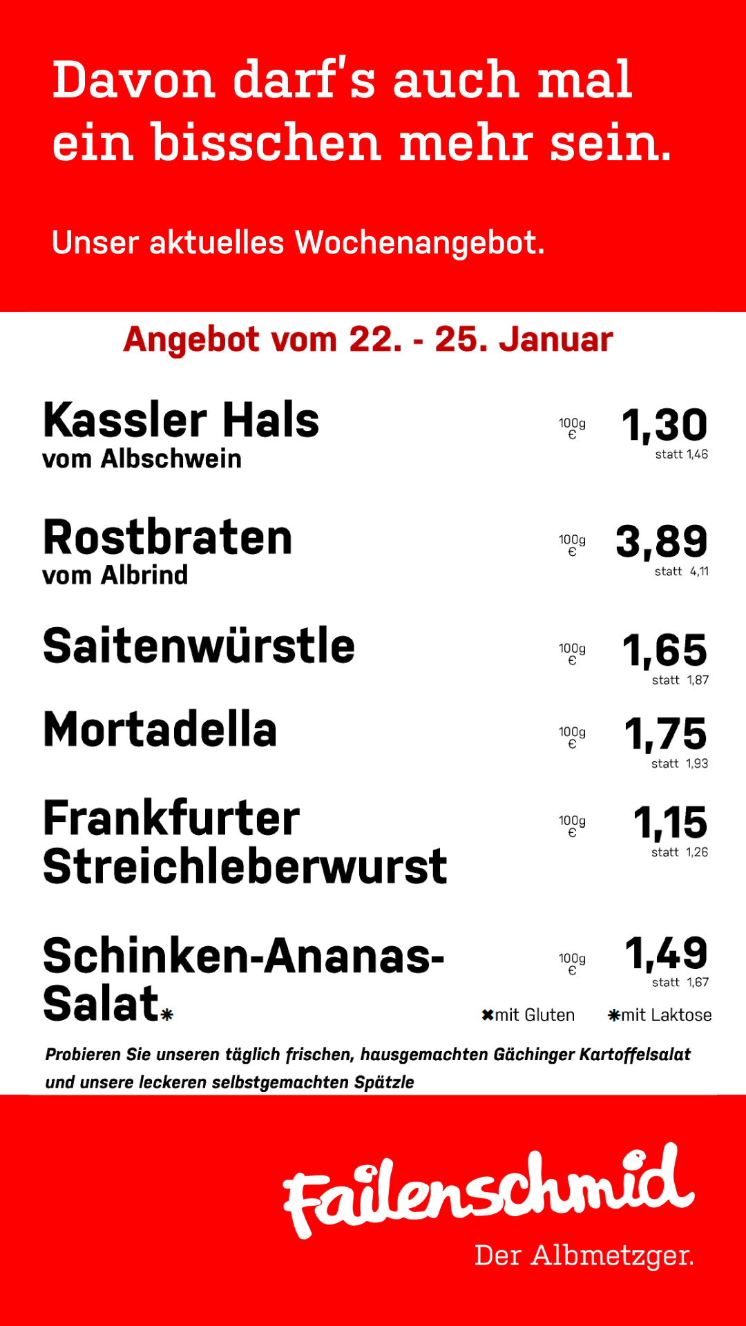 Davon darf’s auch mal ein bisschen mehr sein. Unser aktuelles Wochenangebot aus der Albmetzgerei für unsere Filialen im Landkreis Reutlingen (nicht Merklingen und Stuttgart).