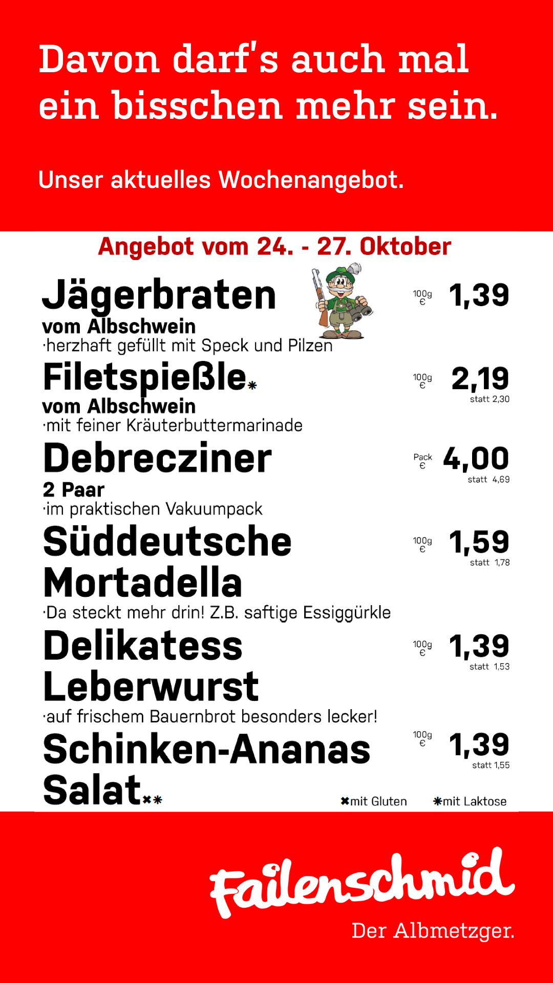 - Rein Albbüffel & exklusiv bei Failenschmid (z.B. Wurzl'n & Stengele oder unsere Buffalos Salamisnacks mit Leinsamenöl aus der Alb-Ölmühle)